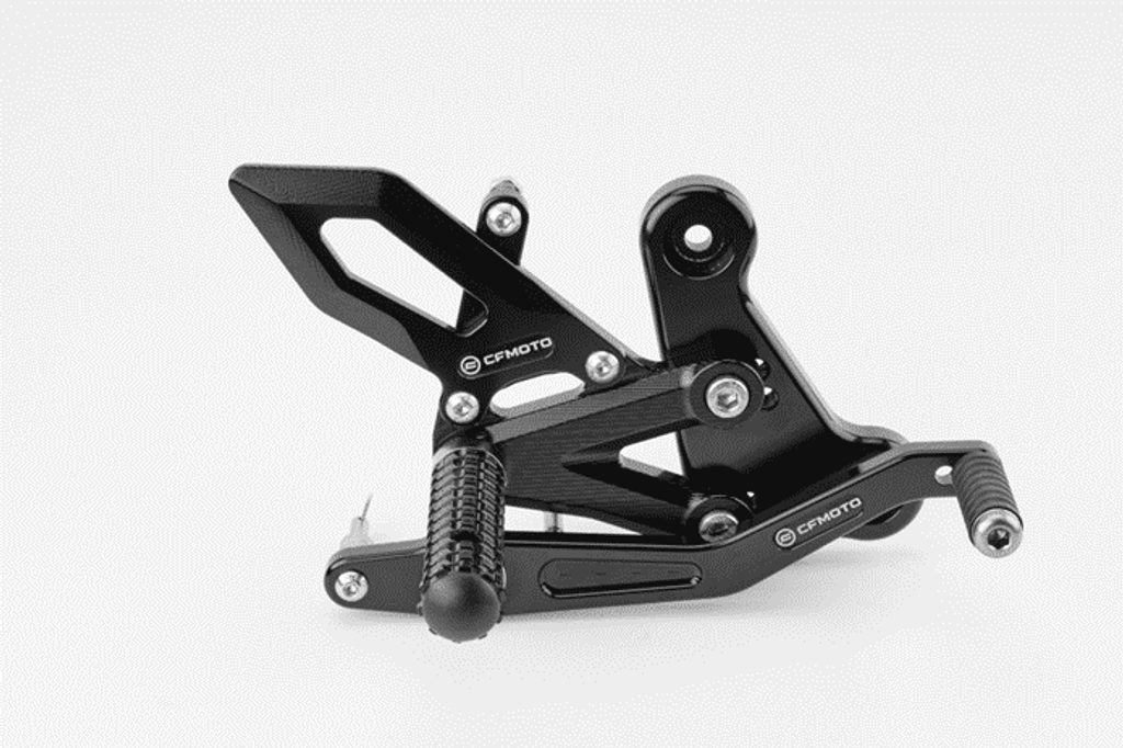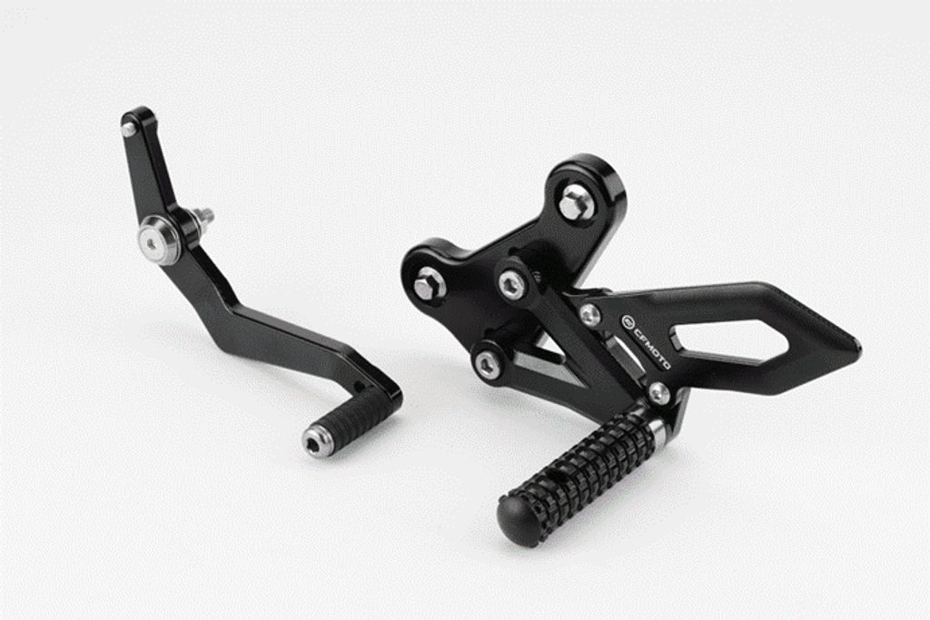Zvýšené nastavitelné stupačky z řady originálního příslušenství CFMOTO zajišťují agresivnější pozici jezdce a podtrhují sportovní charakter motocyklu.