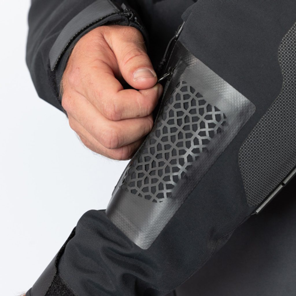 Bezpečnost zajišťují certifikované chrániče ramen, loktů a zad (a volitelné chrániče hrudníku), jakož i konstrukce Airbag Ready - kterou umožńuje použití našich rovnoměrně pevných a pružných panelů z látky X-Stretch, která poskytuje vyšší bezpečnost, lepší pohodlí a volnost pohybu.