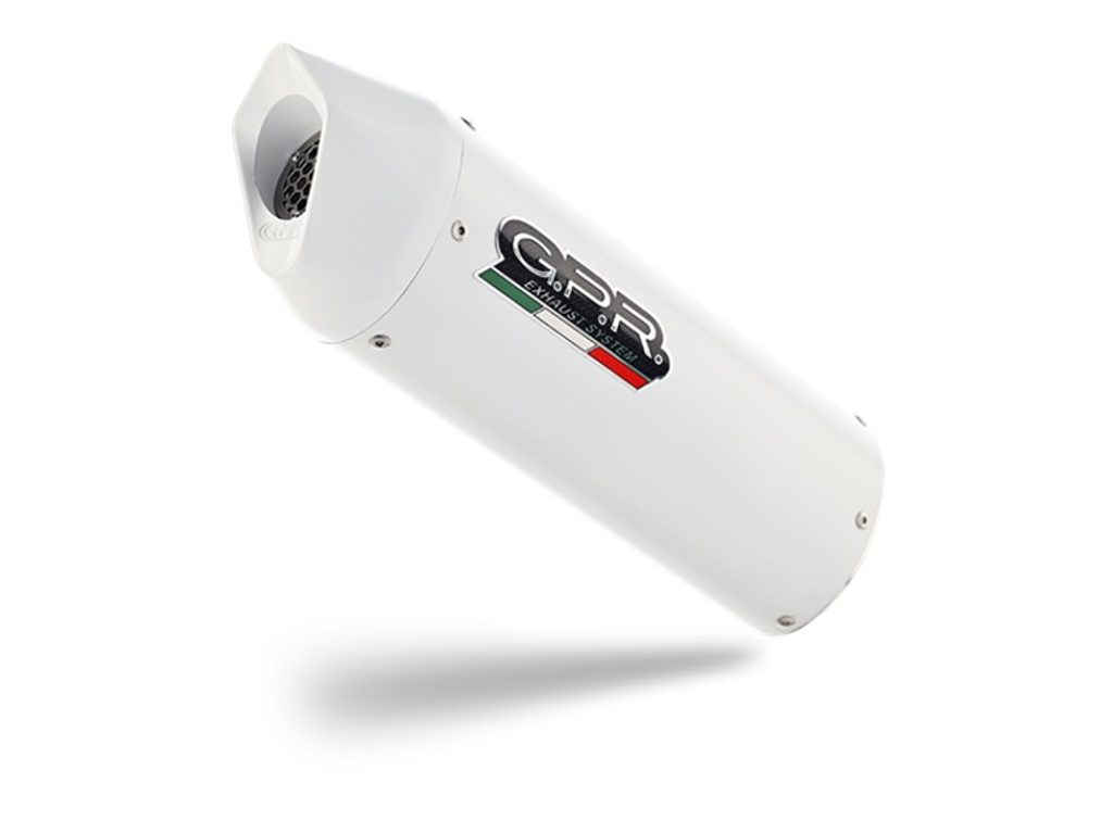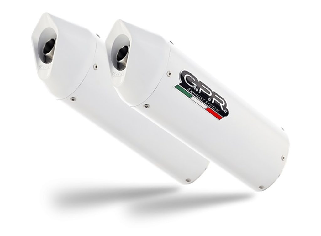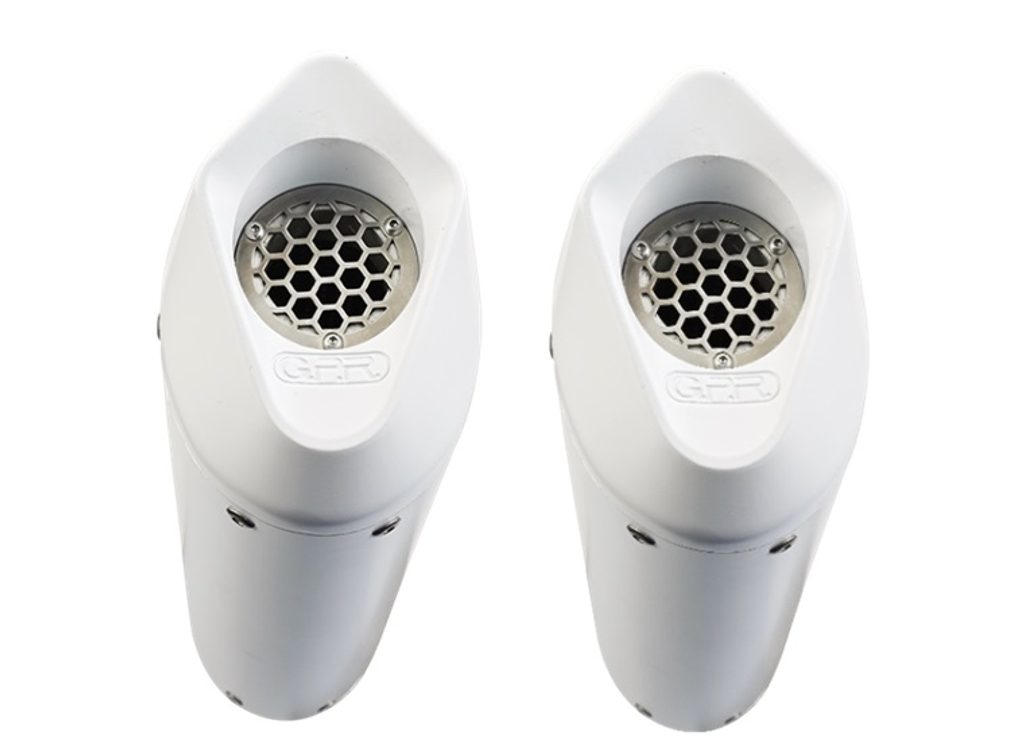 Dvojitá koncovka výfuku uchycená šrouby GPR ALBUS KTM.46.ALB Lesklá bílá zahrnuje odnímatelné dB killery a katalyzátory