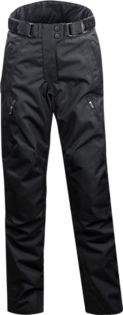 Propracované dámské motocyklové kalhoty s prodyšnou membránou, odnímatelná termovložka, vyjímatelné certifikované chrániče kyčlí a kolen, strečové panely na zadku a kolenou, reflexní prvky, zip pro spojení s bundou