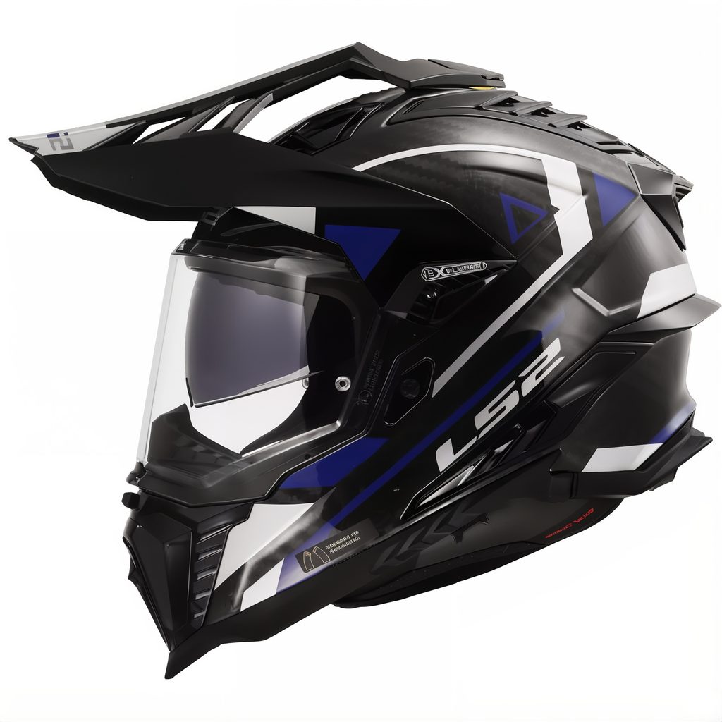 Špičková karbonová enduro helma LS2, integrovaná sluneční clona, čiré opticky přesné Anti-UV plexi s úpravou proti poškrábání, účinné větrání, komfortní antibakteriální antialergický kompletně vyjímatelný a pratelný interiér, rychlé vyjímání lícnic, zapínání dvojitými D-kroužky, 1380g