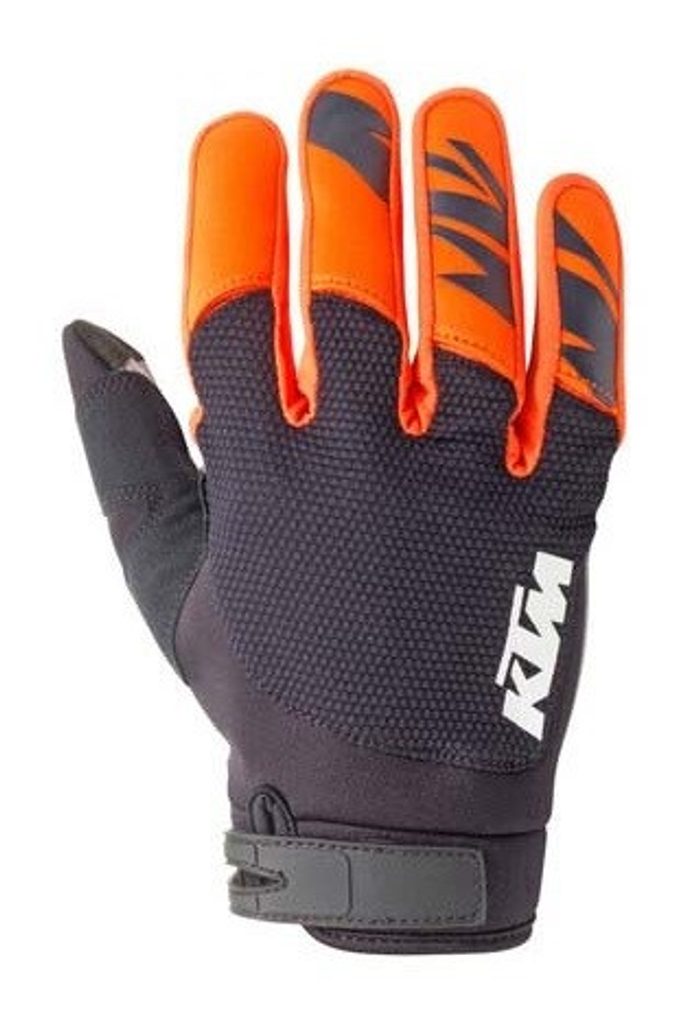 Univerzální moto rukavice KTM pro muže i ženy. Odolné v terénu, s Lycra® klíny pro volnost pohybu a materiálem Nanofront® na dlaních pro dokonalý úchop. TPR zapínání na suchý zip, složení: 50 % nylon, 45 % polyester, 5 % spandex.