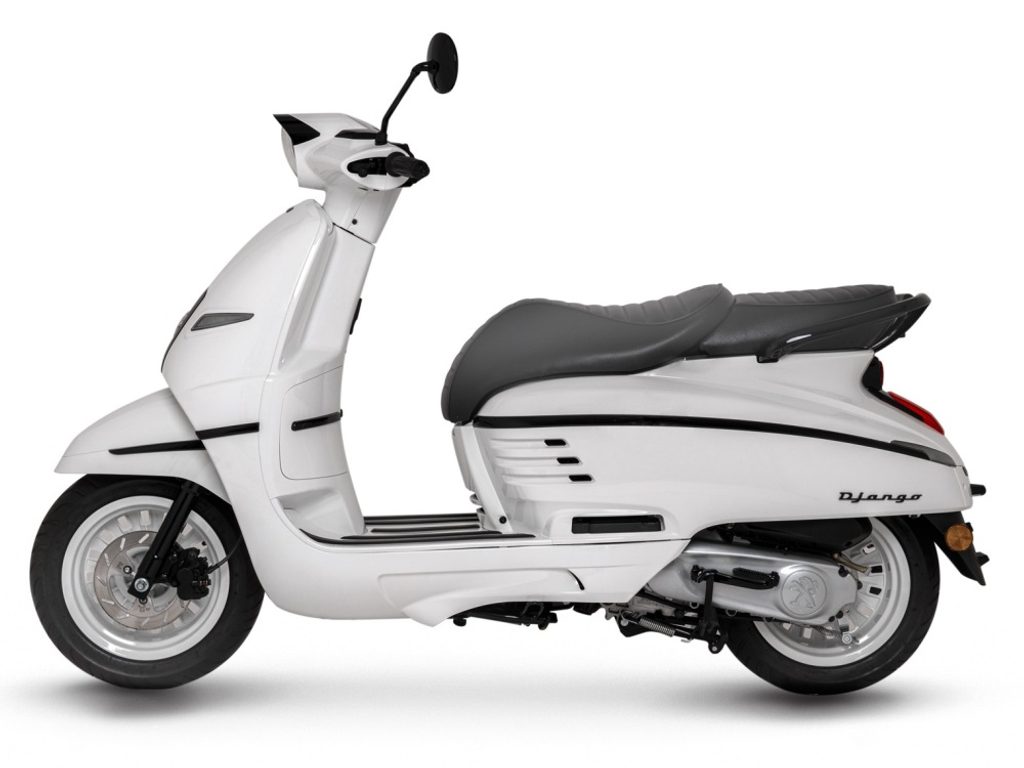 Stylový skútr Peugeot Django se nabízí v několika barevných variantách. Dvoubarevné provedení patří ke stálicím nabídky. Standardní verzi každým rokem doplňují speciální edice, které dokáží zaujmout svým neotřelou barevnou kombinací a dodávají Djangu svěží vzhled a pořádnou dávku sexappealu. Pro konzervativní zákazníky je zde černá varianta s koženým hnědým sedlem, která působí luxusním dojmem.