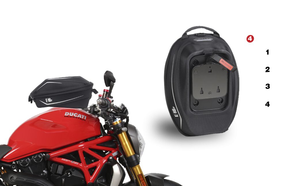 PIN SYSTEM Inovativní PIN SYSTEM umožňuje bezpečně a snadno připevnit tašku k nádrži motorky. 3 nebo 4 z původních šroubů víčka nádrže jsou nahrazeny diskrétními „piny“, což činí celou montáž velmi jednoduchou a hotovou za pár minut. Kompatibilní s taškami E04P, E10P a E16P. Stačí si vybrat tu správnou montážní sadu pro váš model motorky.