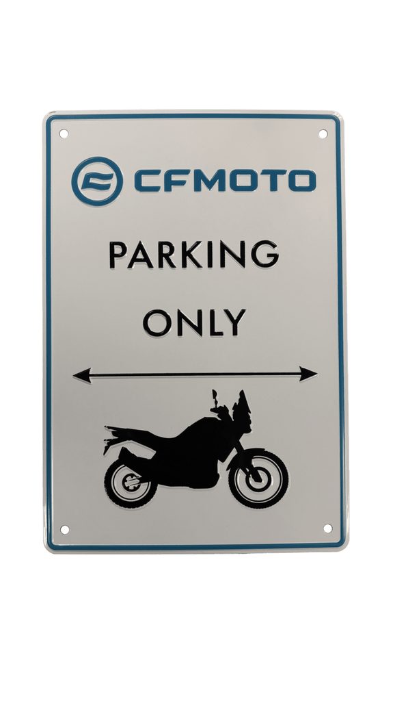 Závěsná plechová cedule s piktogramem motocyklu a textem "CFMOTO PARKING ONLY" z kolekce originálních doplňků CFMOTO.