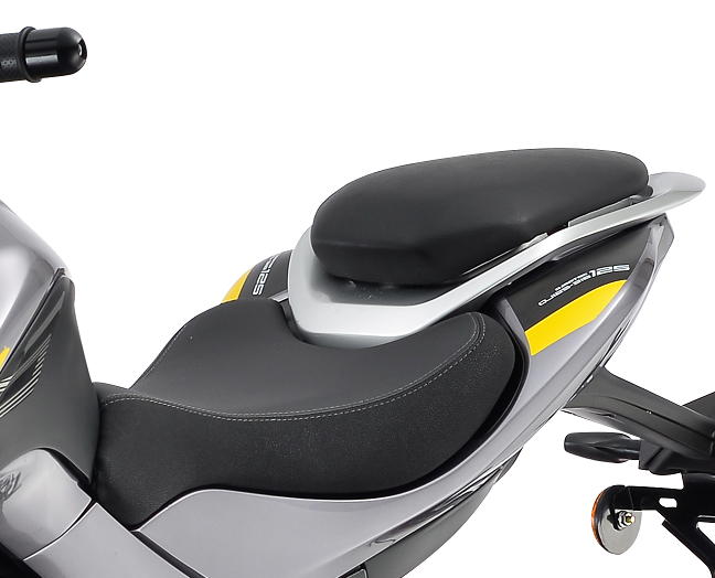 Sportovní dvoudílná sedadla s gravírovaným logem nabízí skvělý jízdní komfort a perfektní ergonomii. Nízká poloha sezení také poskytuje menším řidičům velkou jistotu a bezpečnou manipulaci s motocyklem v každé jízdní situaci.