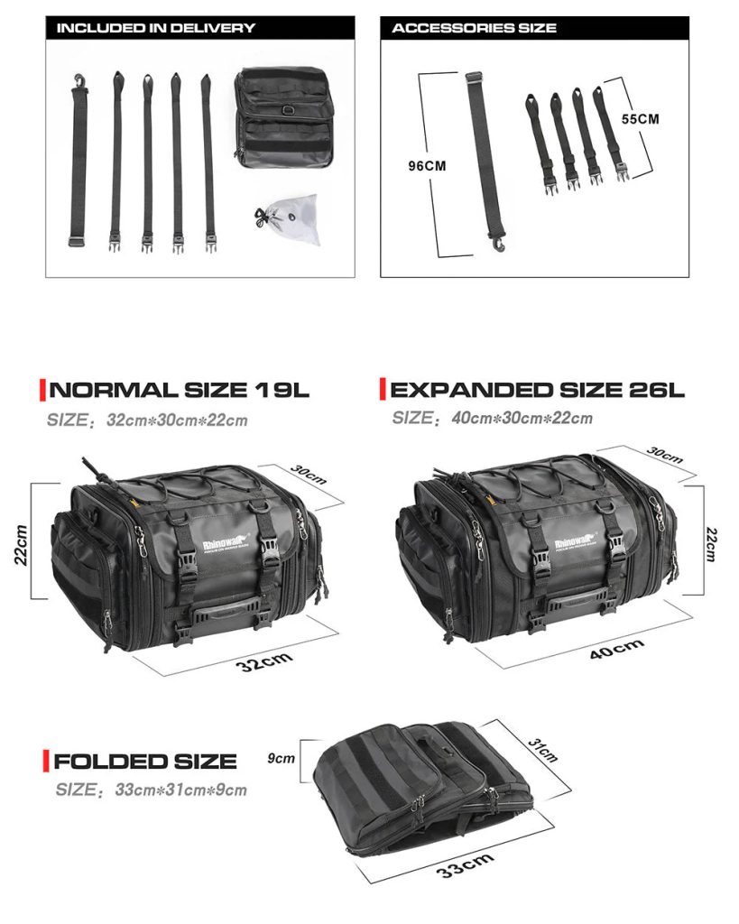 Normální objem hlavní brašny je přibližně 19 litrů a objem oboustranného rozšiřovacího zipu je přibližně 26 litrů.