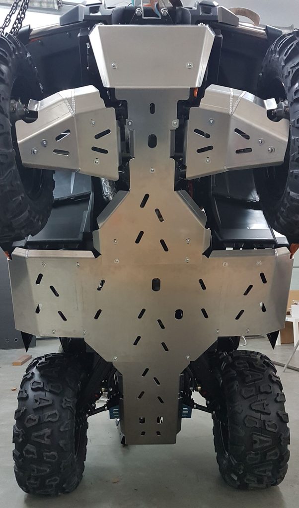 Kompletní kryty podvozku Shark Accessories, odolná ochrana spodní části čtyřkolky, z anodizovaného a lehkého 4 mm hliníku letecké kvality, montážní otvory pro snadnou údržbu, výřezy pro snadnější čištění čtyřkolky, včetně integrovaných krytů nášlapů, nízká hmotnost, snadná montáž
