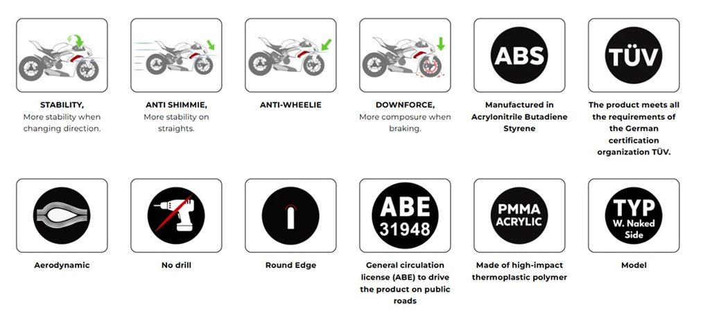 Spoilery jsou navrženy a vyrobeny kompletně v Barceloně a kombinují pokročilé inženýrství s designem inspirovaným závodními motocykly. Jsou vyrobeny z 4 mm akrylátu CN s zaoblenými hranami pro zvýšenou bezpečnost a montují se pomocí 2 mm kovových držáků s texturovanou černou úpravou.