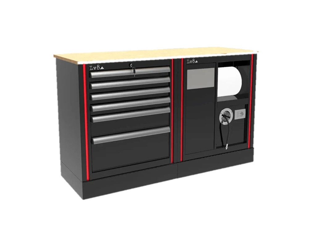 Závodní pracovní stůl složený ze dvou skříněk na kolečkách: jedna skříňka se 6 zásuvkami a druhá servisní část vybavená košem na odpadky, držákem na papírové utěrky, přípravou pro elektrickou zásuvku a naviják na hadici. Snadná manipulace a rychlá demontáž výrazně usnadňují nakládku a vykládku mezi dodávkou a servisní zónou.