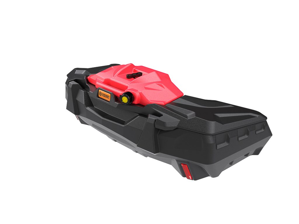 Uzamykatelný zadní box na čtyřkolku z vysoce kvalitního nárazuodolného vysokohustotního polyetylenu s integrovaným kanystrem na 7l, zamykání na dvě kovové přezky, těsnění proti vnikání vody, dvě zadní odrazky, černý