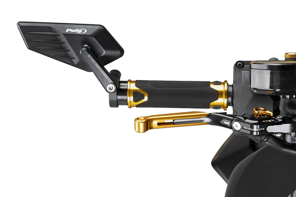 Neschválené zpětné zrcátko je navrženo k montáži na konec řídítek a nabízí funkční i estetické řešení, které se dokonale integruje s liniemi motocyklu. Ve srovnání s aktuálními modely přináší novou úroveň nastavení, která výrazně zlepšuje přizpůsobení individuálním preferencím jezdce. Tento systém umožňuje naklopení ramene zrcátka pro přesnější nastavení úhlu pohledu, přičemž zachovává možnost rotace vzhledem k řídítkům pro správnou orientaci. Konečné doladění je dosaženo prostřednictvím vysoce přesného kuličkového kloubu, který umožňuje jemné a bezpečné nastavení, zajišťuje stabilitu při jízdě a zabraňuje nežádoucím pohybům způsobeným vibracemi.