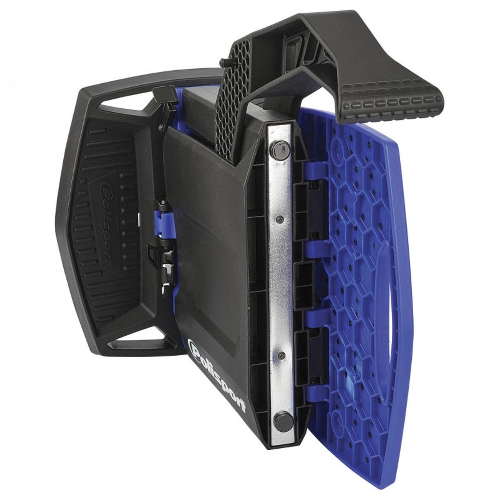 Polisport Zvedací stojan je první hybridní stojan (vyrobený z plastu a kovu), který je zároveň zvedací a skládací. Pomocí zvedací páky zvednete motocykl s minimálním úsilím. Má pevnou a odolnou strukturu, která je zesílená kovovým rámem. Díky tomu má stojan nosnost až 200 kg. Vrchní část je vyrobena z gumového kompozitu, který zajišťuje stabilitu motocyklu. Úložné přihrádky se hodí na odložení nářadí při údržbě motocyklu